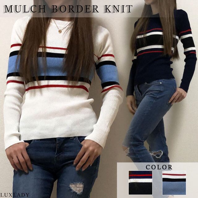 【マルチボーダー ニットトップス 】クルーネック タイト ブラック ホワイト ブルー ライン入り トップス レディース